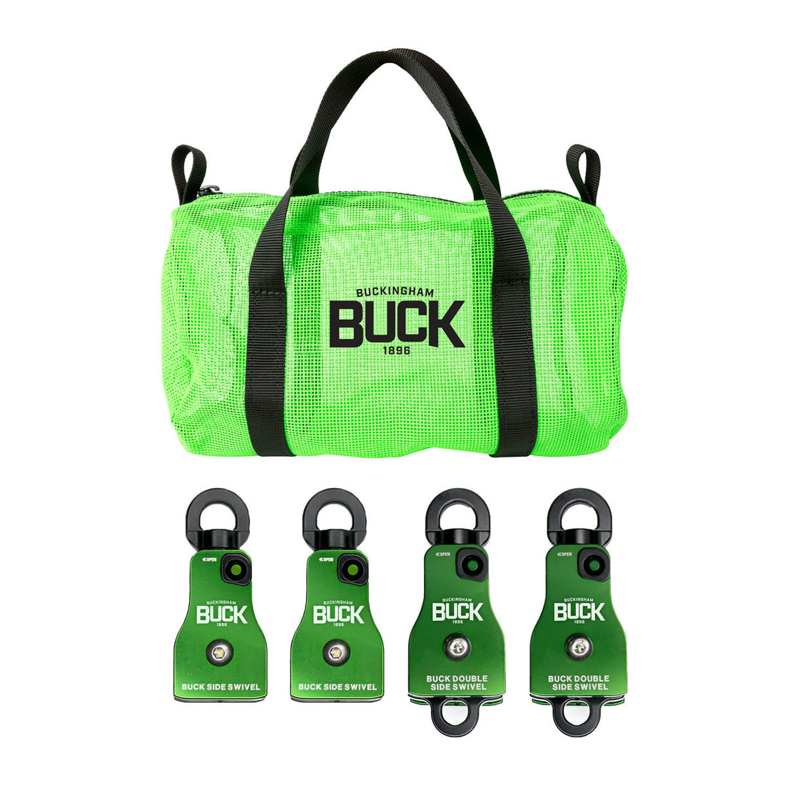The Buck Auxiliary Pulley Kit features heavy duty aluminum double & single sheave side swivels...