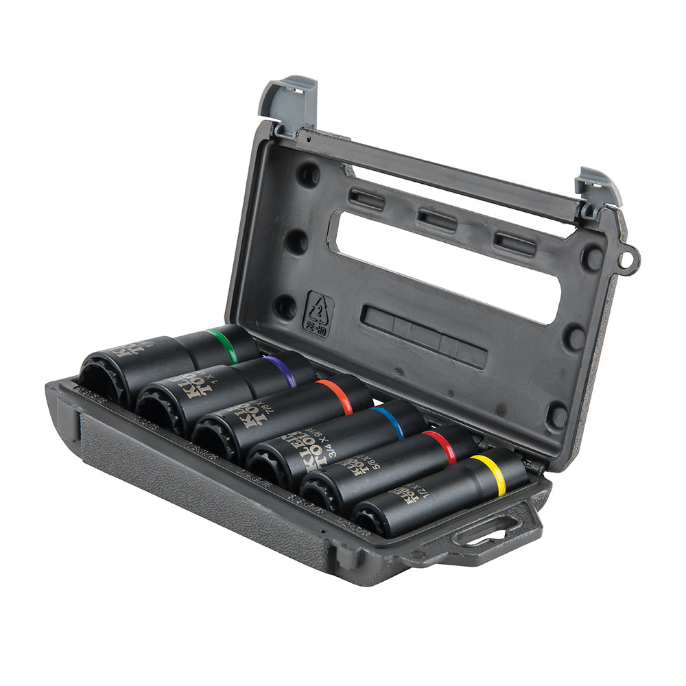 This 6-piece set includes 6 sockets with 12 sizes in total, specifically: 1-1/8 x 15/16-Inch, 1 x 13/16-Inch, 7/8 x 11/16-Inch, 3/4 x 9/16-Inch, 5/8 x 7/16-Inch, and 1/2 x 3/8-Inch. These sockets are designed for use with impact wrenches, such as Klein's 1/2-Inch Compact Impact Wrench (Cat. Nos. BAT20-CW/BAT20-CW1), and feature a high-torque, 12-point design for easier positioning on fasteners. The sockets also have a deep socket with a 1/2-Inch drive, making them ideal for pole hardware installation and removal. Additionally, they have a cross hole design to maintain a strong connection to the adapter or impact wrench. The sockets are
