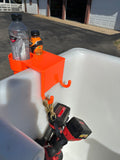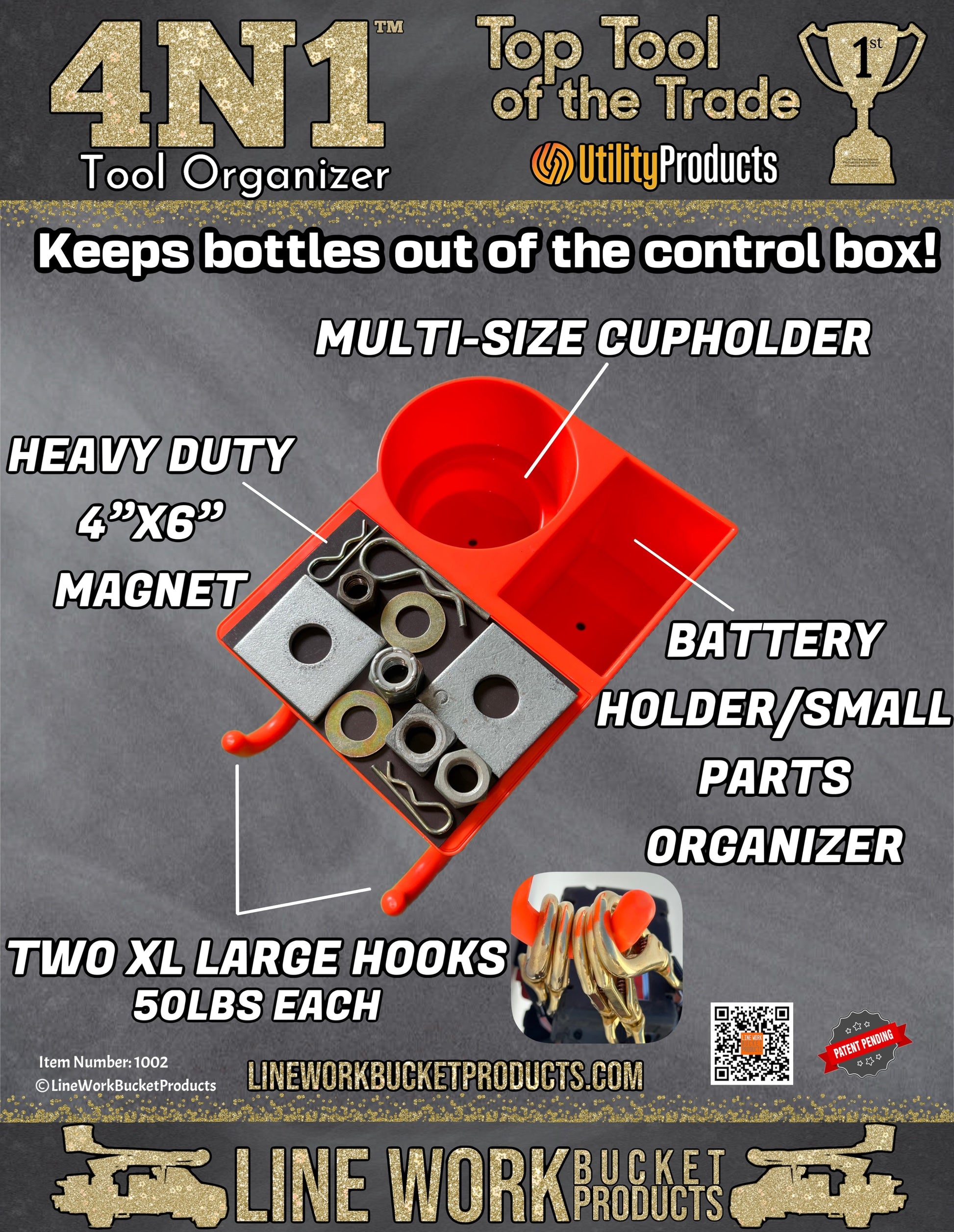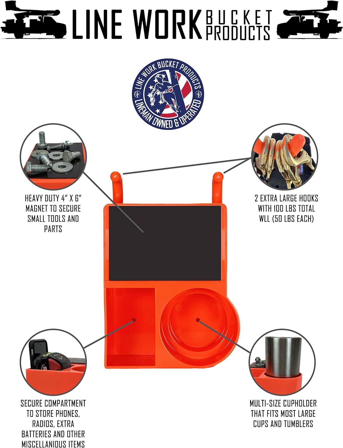 Helps bucket truck workers stay hydrated, organized, and accessible with a phone/radio compartment. The hooks are extra large for tools and hoists. Fits 3" Bucket Lips