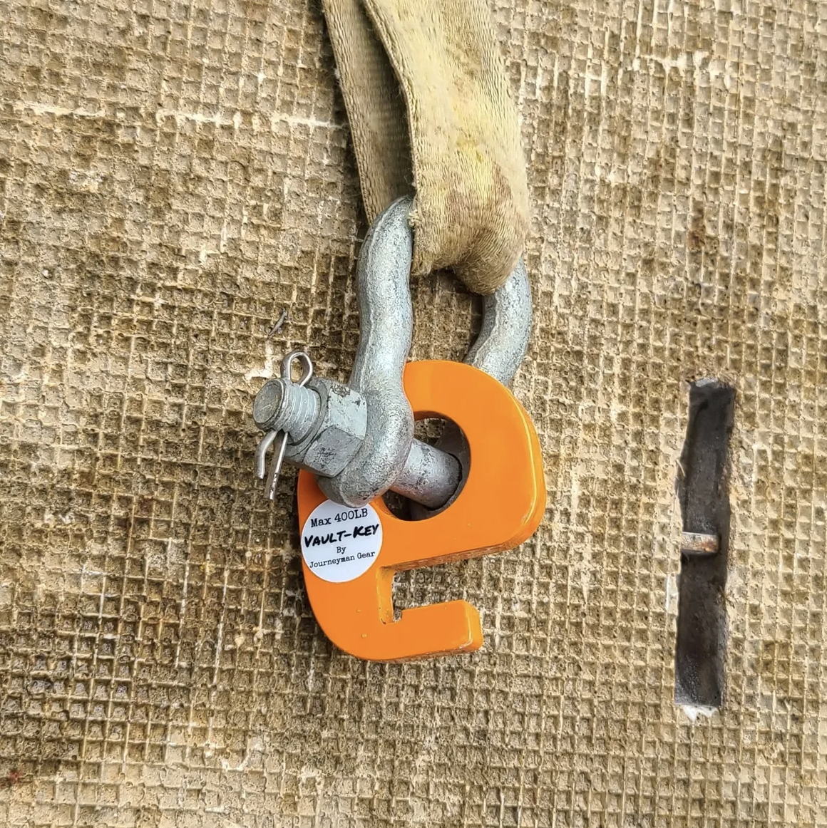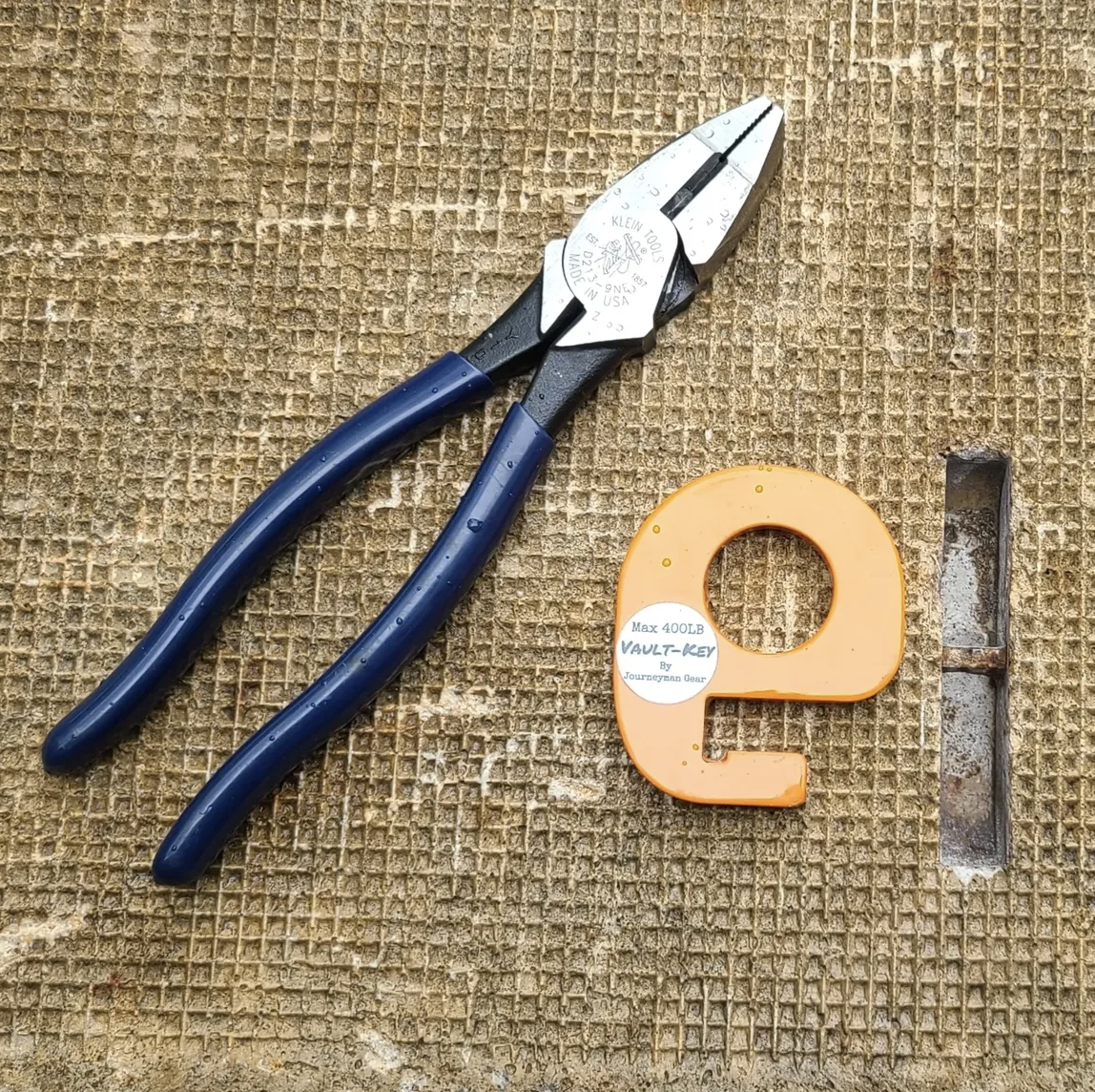 Introducing the Vault-Key. This tool is a solution to a common problem encountered in the field. It offers a secure method of opening underground vaults and pedestal lids with its laser-cut 3/8" steel construction and Hi-Viz orange powder coating. The Vault-Key enables us to attach shackles, hooks, and slings to heavy concrete lids for easier lifting and rigging. Say goodbye to makeshift tie wires and struggling with pliers. Field testing shows that linemen are more likely to move lids further away from open vaults while using the Vault-Key, eliminating the risk of tripping, especially during nighttime operations. This American-made tool is compact yet strong enough to hook onto a digger truck.