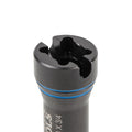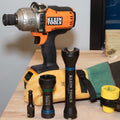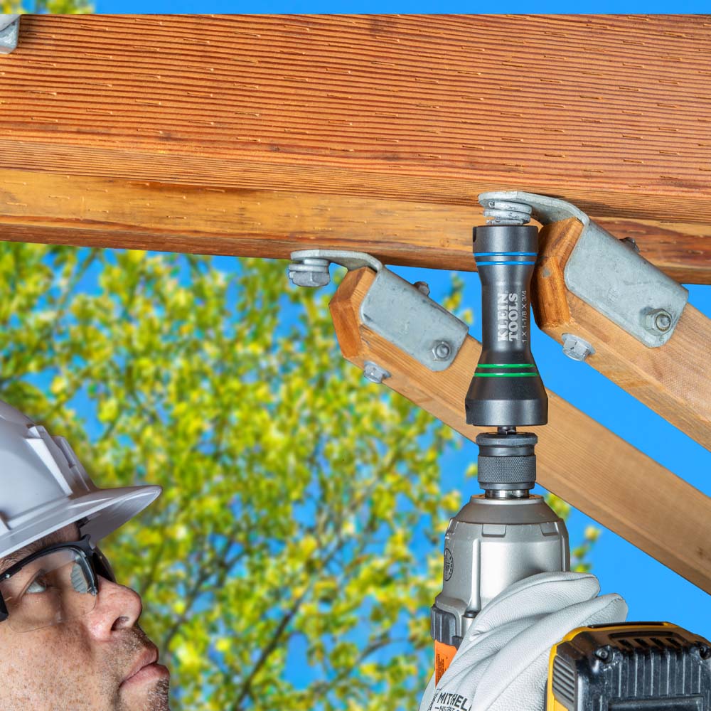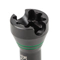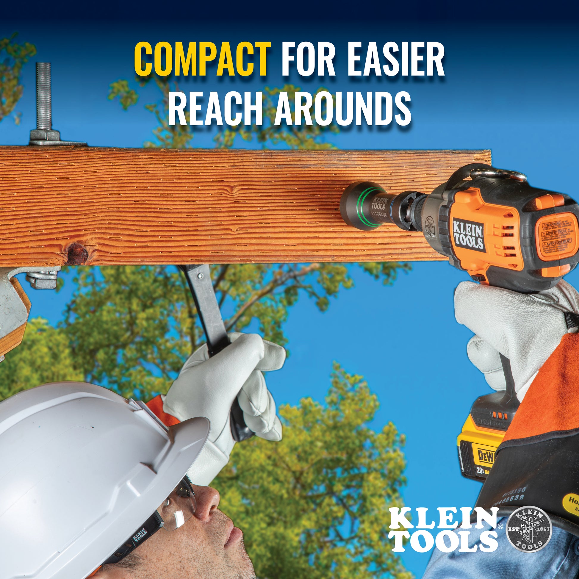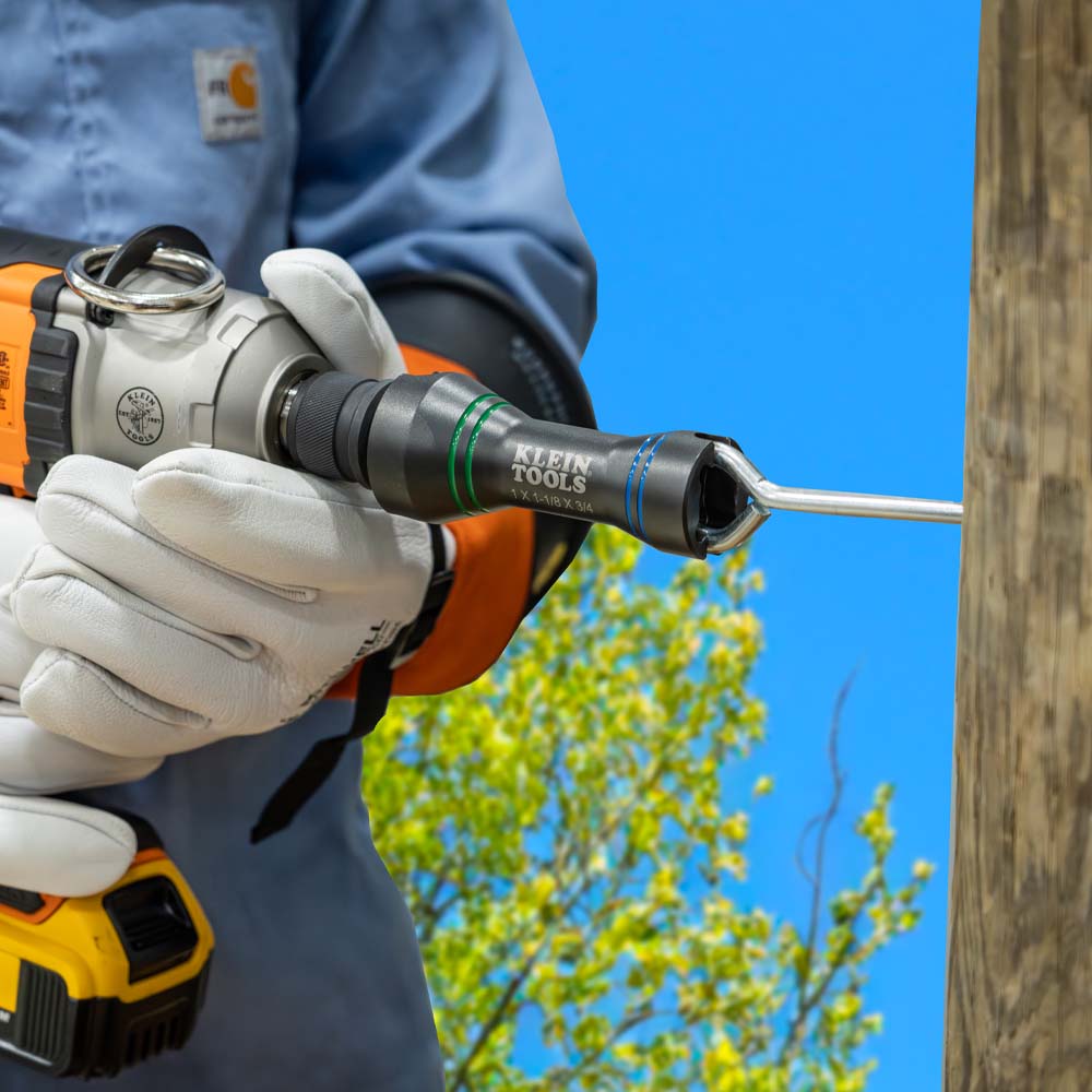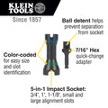 The 5-in-1 Mini Impact Socket includes three square socket sizes - 3/4-Inch, 1-Inch and 1-1/8-Inch - as well as small and large alignment slots. These slots allow for easy tightening and loosening of most pole hardware, including pole steps, drive hooks, eye bolts, and J-hooks. The socket has a 13/16-Inch diameter, and its compact, hollow shaft (measuring 4-1/2-Inch or 11.4 cm) assists linemen in reaching around poles. The socket also comes with a 7/16-Inch hex quick-change adapter, which reduces weight and improves ease of use for utility workers. Additionally, the fine-tuned ball tip provides improved retention, minimizing drops. The socket is impact rated and color-coded with double lines to identify its slotted feature, and a single line for its socket size. A replacement adapter (Cat. No. NRHDA)