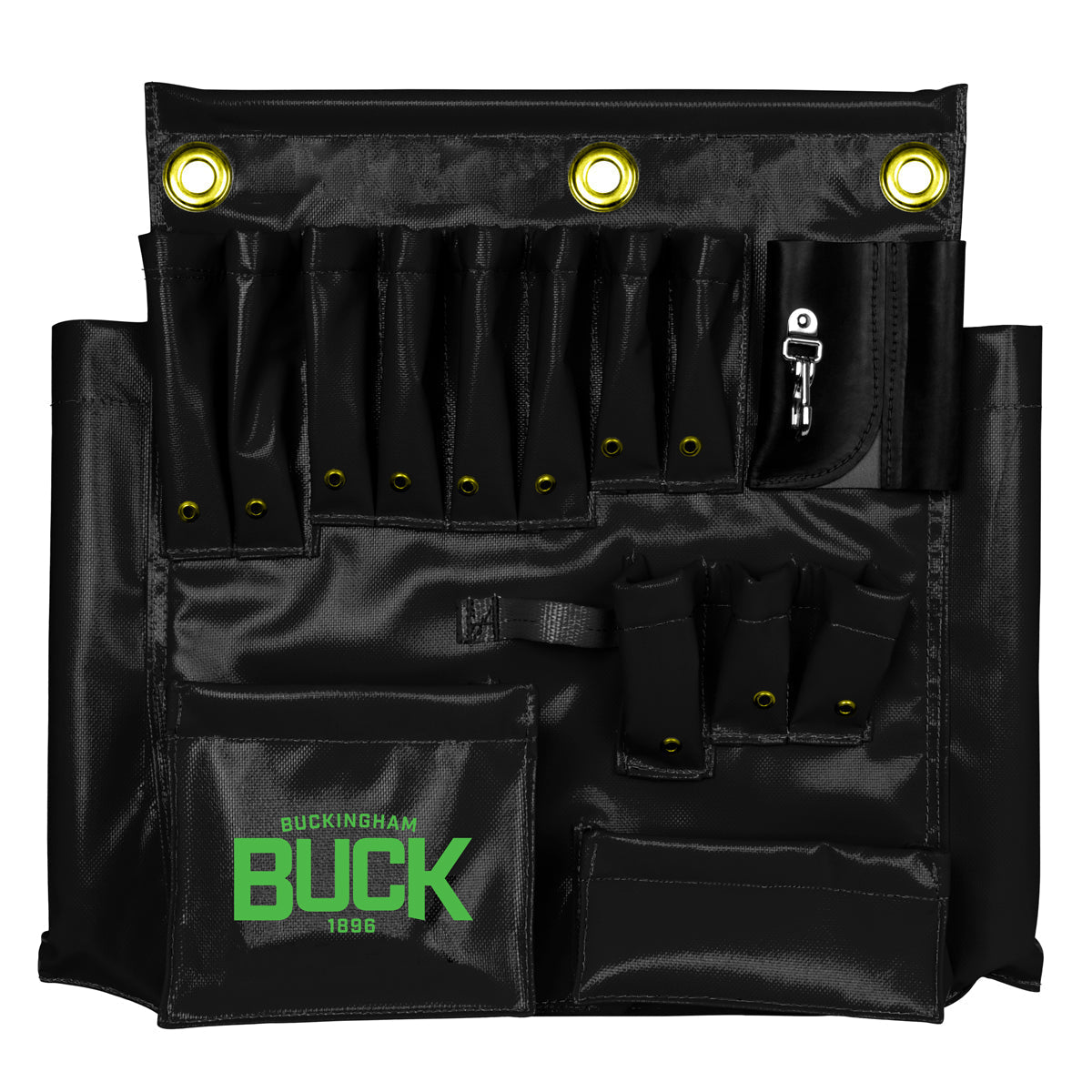 This heavy-duty tool apron is designed for linemen and bucket truck professionals who need organized, secure access to tools while working at height. It’s constructed from vinyl-coated nylon with sewn-in pockets layered through two durable sheets for added strength.