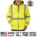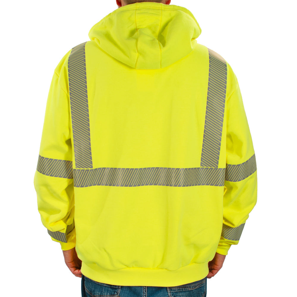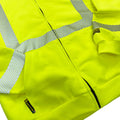 Our Hi-Vis hoodie comes with segmented striping which is more flexible and breathable than solid striping. We even reinforced the stitching on the corners and stress points for increased durability. All our hoodies are made in the United States and individually serialized for traceability and come with a one-year repair warranty.