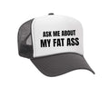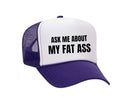 Wear this trucker hat and be prepared for questions about your ass! With the phrase "Ask Me About My Fat Ass" printed on the front, you'll have a witty response for anyone who's curious. Perfect for those who don't take themselves too seriously and love a good laugh.