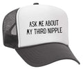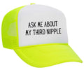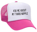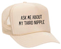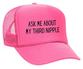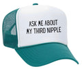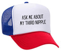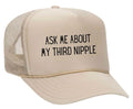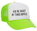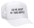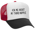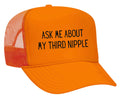 Unleash your bold and adventurous side with our Ask Me About My Third Nipple Trucker Hat! Made for the risk-takers, this hat showcases the funny fact that only 0.2% of people have "supernumerary nipples." Wear it with pride and start interesting conversations wherever you go!