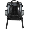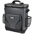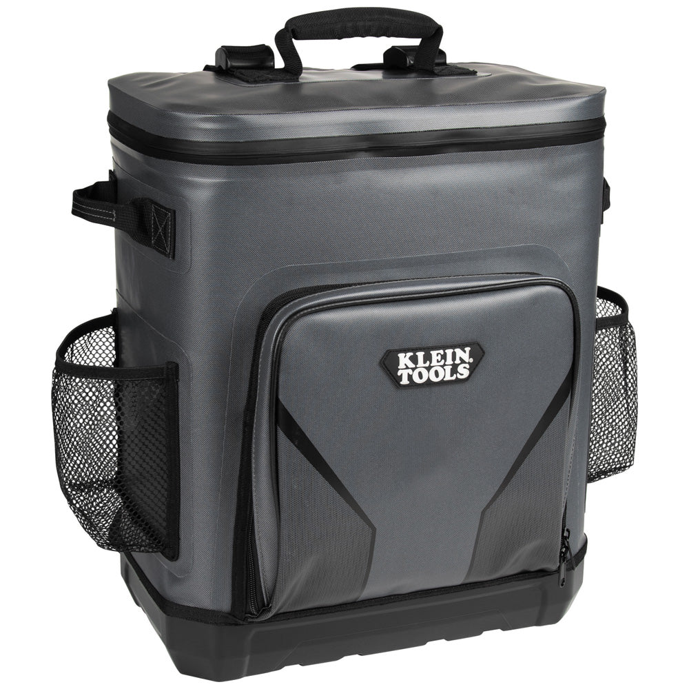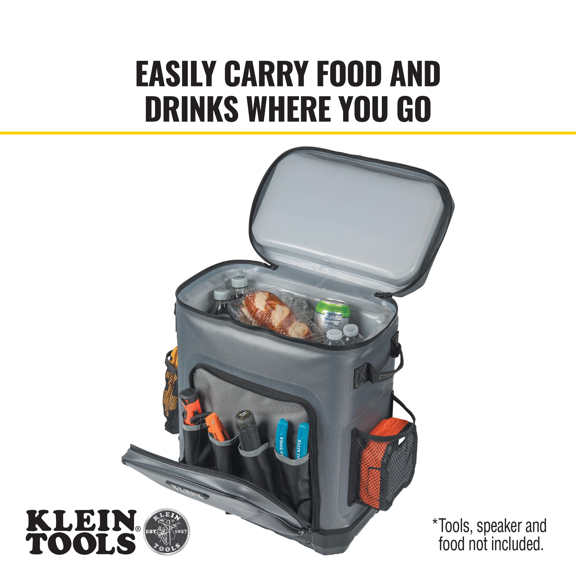 The backpack cooler maintains the coldness of items for up to 24 hours and can hold up to 30 (12 fl oz) cans along with 7 pounds of ice. Its molded bottom is durable against various elements, making it suitable for a jobsite, campsite, beach, woods, or backyard. The front pocket, reinforced with 1680d material, includes four inner pockets designed to carry utensils such as forks and knives, as well as tools like pliers and screwdrivers. It features a stainless steel bottle opener and a bracket for a headlamp, ideal for nighttime use. The side mesh pockets are perfect for a bottle of wine, outdoor gear, or a Klein Tools Rechargeable Bluetooth® Jobsite Speaker (Cat. No. AEPJS3). For comfort, it has back padding and adjustable straps to distribute the weight of a heavy load evenly. The top opens widely with a leak-resistant zipper for convenient loading and access to chilled food and beverages. Constructed with robust, water-resistant materials, it is designed for easy cleaning both inside and out.