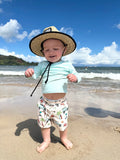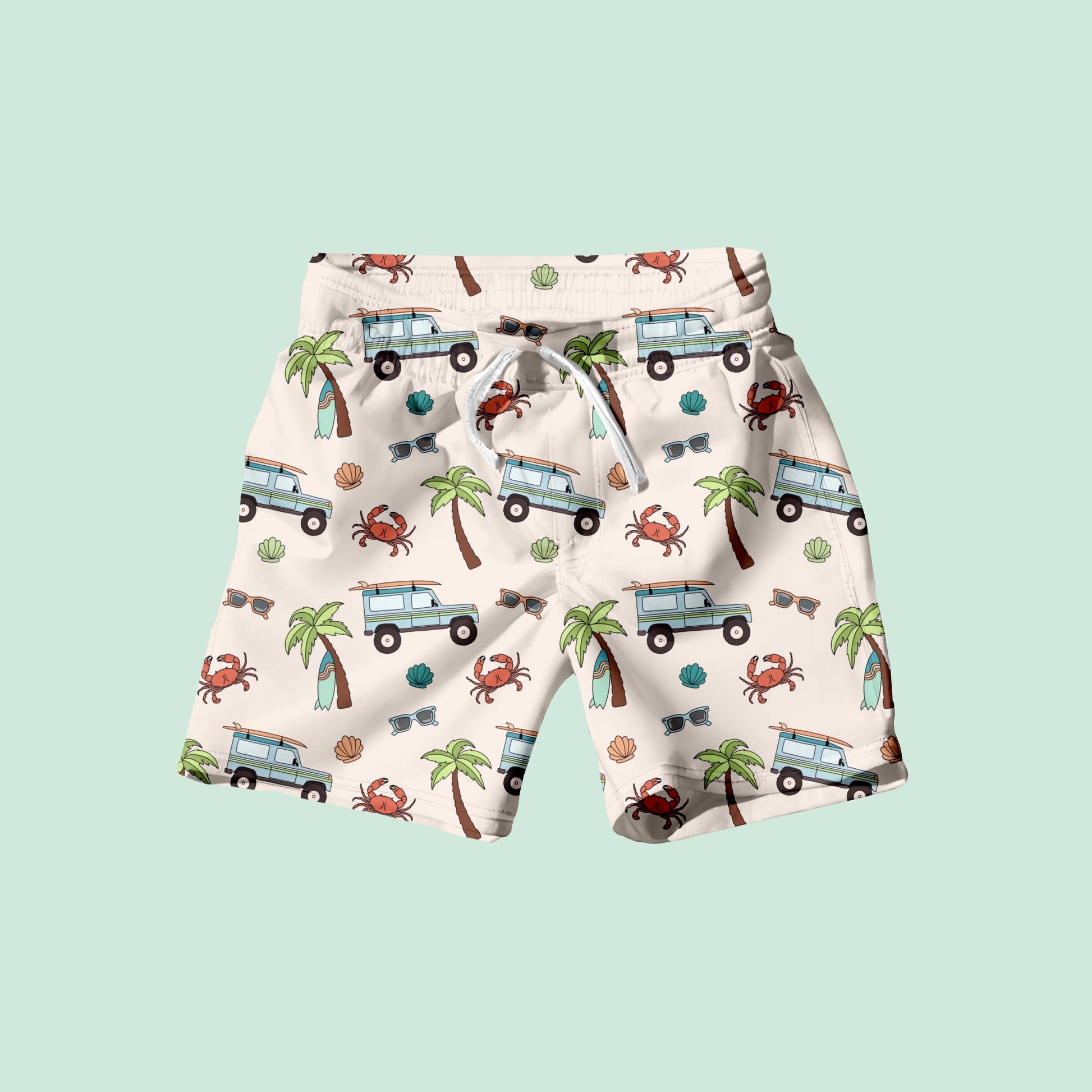 Peachy Dreams first ever swim line includes these rad beach and surfer vibe shorts with surfboards, palm trees, sunglasses, a truck and a crab. These are perfect for any beach or pool day!