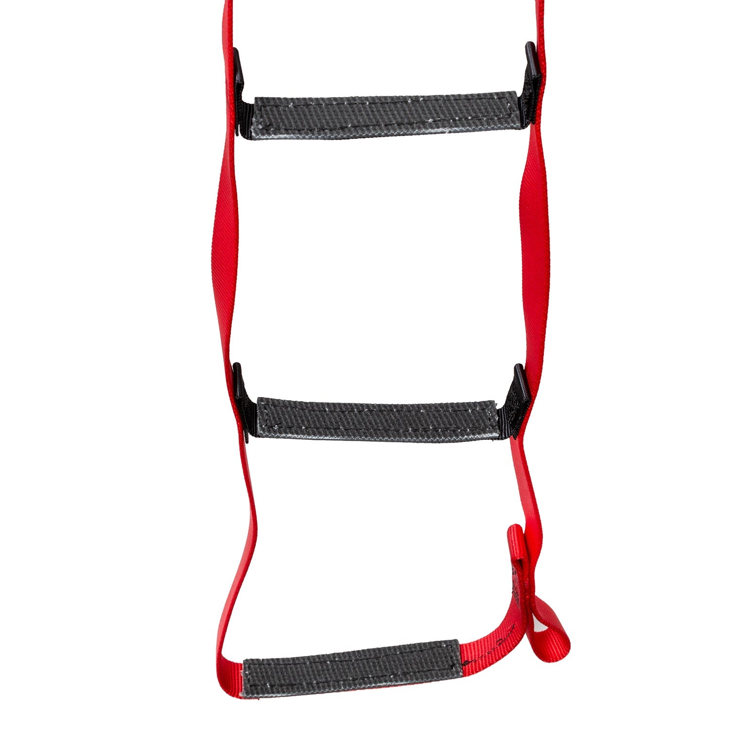 The ladder features a top web loop with a wear guard for added protection against wear, along with a bottom web loop. The top web loop with the wear guard is the connection point used to suspend the ladder from the bucket and the bottom web loop may be used for attaching a tag line to help control the swing of the ladder or to attach another section of the ladder for added length (if needed).