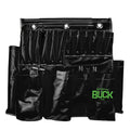 A heavy vinyl coated nylon aerial basket tool apron with sewn-in pockets through two layers of vinyl-coated nylon plus one layer of heavy canvas. Two large 3/4″ grommet holes reinforced with PVC rods are used to suspend the apron from the bucket using Buckingham PVC or polymer hooks.