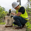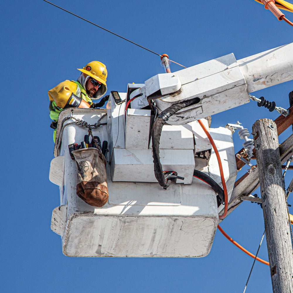 A workhorse straight‑wall canvas bucket built for the realities of linework. The Klein 5104S delivers dependable strength with heavy‑duty No. 4 canvas, a leather‑reinforced bottom, and a full‑length web handle that runs down both sides for added load support. Rated for 100 lb, this bucket is built to haul tools, hardware, and essentials safely up the pole or structure. A high‑density polyethylene top ring maintains shape under load, while the interior 8" x 8" pocket keeps small items organized. Includes a swivel snap for secure attachment.