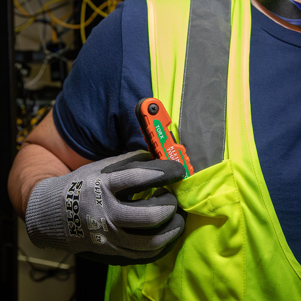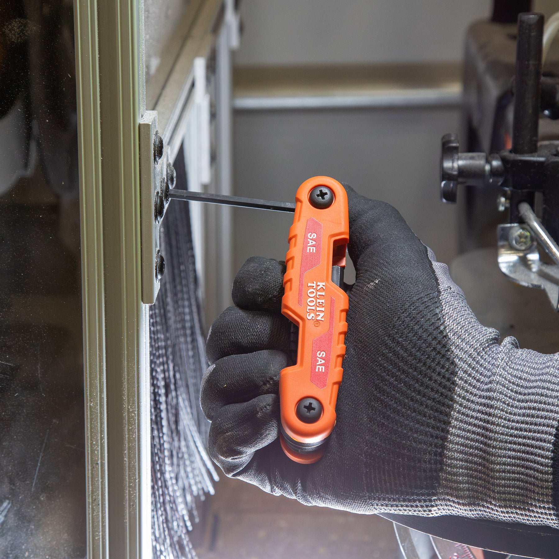 Klein Tools' new Compact Folding Hex Key line features the same highly durable reinforced nylon handle with easy key access but is now pocketable for more convenient storage and carrying. Our hex key sets feature a strategically placed #2 Phillips fastener on the outer body, ensuring effortless adjustment of key tension to suit your preference. Klein Tools' Hex sets are color-coded for quick identification: red for Inch, blue for mm and green for Torx, enhancing efficiency.