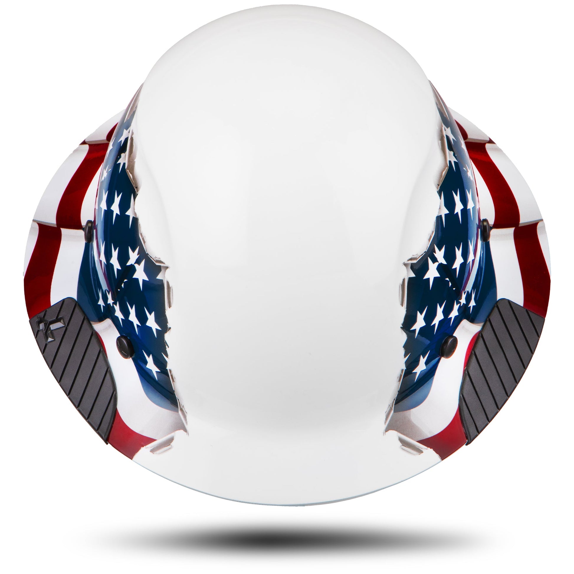 The DAX American Flag Hardhat is a full brim, fiber reinforced resin hard hat offering a 6 point suspension system for superior comfort and impact protection. It features an innovative synthetic leather comfort dome and an over-sized ratcheting fitment dial that makes adjustment easy even while wearing gloves.