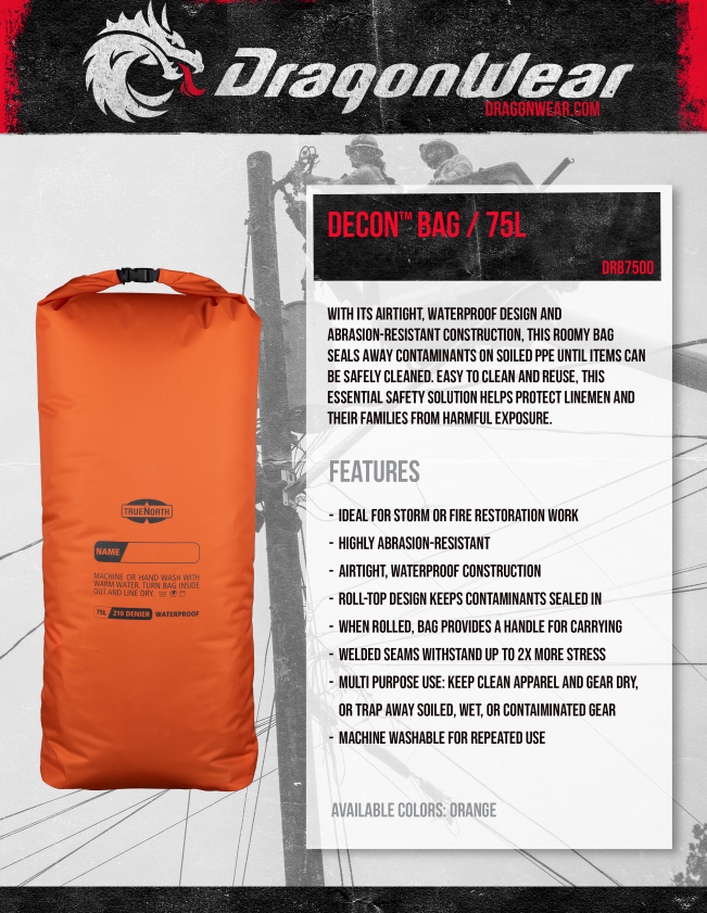 The Decon Bag has a very important job; to protect the firefighter from cancer-causing contaminates left on dirty turnout gear. With its airtight design and abrasion-resistant construction, this roomy bag reliably traps soiled gear and prevents carcinogens on PPE from migrating to the apparatus' cabin until items can be safely laundered. The durability of the 210D coated Nylon combined with welded seams allows the Decon Bag to be washed and hung to dry for re-use.