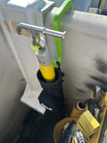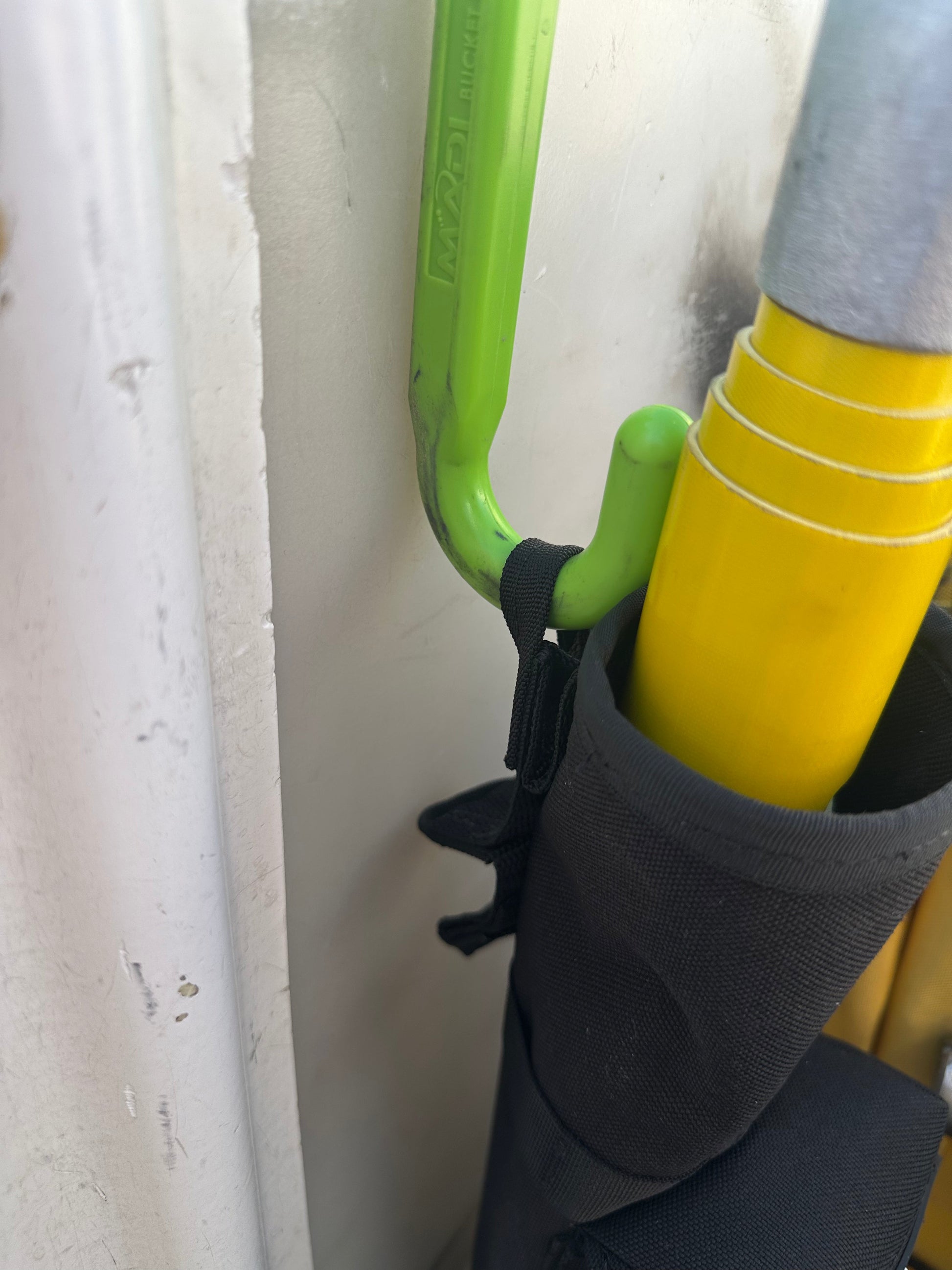 This bag was designed to fit small extendo sticks. voltmeter pocket on bottom, socket pocket on top. 3 hanger tabs to adjust the height.