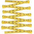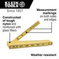 This tape measure features black markings on a yellow background, with red stud center markings at every 16 inches. The measurements are indicated on both sides and edges, graduated to 1/16 of an inch. The graduations are engraved on both sides for durability. It is constructed from robust nylon, reinforced with glass fibers for enhanced durability, and resistance to weather, abrasion, and most chemicals. It includes positive locking joints and stainless steel spring hinges for increased strength, and it offers inside reading of SAE measurements.
