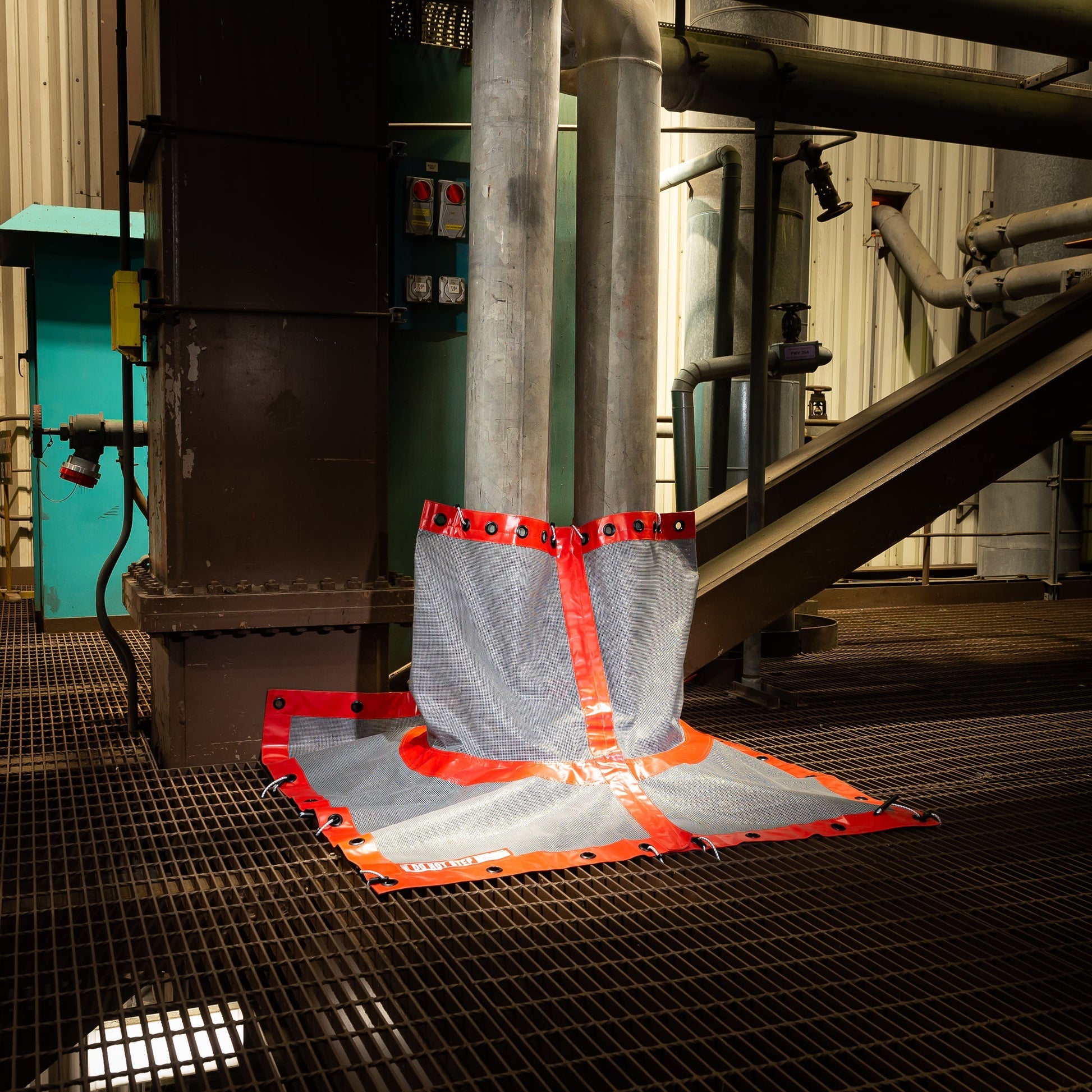 GRIPPS® Gap Wrap offers a convenient and efficient solution for covering challenging floor penetration areas. Designed for easy reusability across various jobs, simply open or close the center Velcro to encase a pipe. The product features numerous stainless steel eyelets, allowing for additional security through the use of cable ties or similar