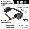 The Hard Hat Turbo Fan is designed to fit securely on Klein Tools Safety Helmets and Hard Hats, either through its secure metal clip or by using the included dual-mount strap and hinged bracket. This compact and lightweight fan offers quiet operation and long-lasting comfort, with three selectable modes and adjustable vents to focus airflow up or down. When not in use, the hinged bracket allows for easy storage or can be extended for a customized cooling experience. Additionally, the fan's dual USB port battery allows for the addition of an extra cooling fan (Cat. No. 60822) for enhanced cooling. The included rechargeable modular battery (Cat. No. 29025) can be swapped with a spare for extended runtime. This product comes with a rechargeable battery, USB-A to USB-C charging cable, hinged bracket, and dual-mount strap.