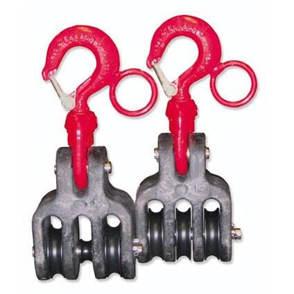Hastings high impact, dielectric thermoplastic, insulated blocks are ideal for hot line use. Sheaves are made with fiberglass reinforced nylon material and stainless steel shafts. Swivel hooks are plated, include safety latches and eyes for application with hot sticks. Set includes upper 3-sheave block and lower 2-sheave block. Blocks only, no rope included.