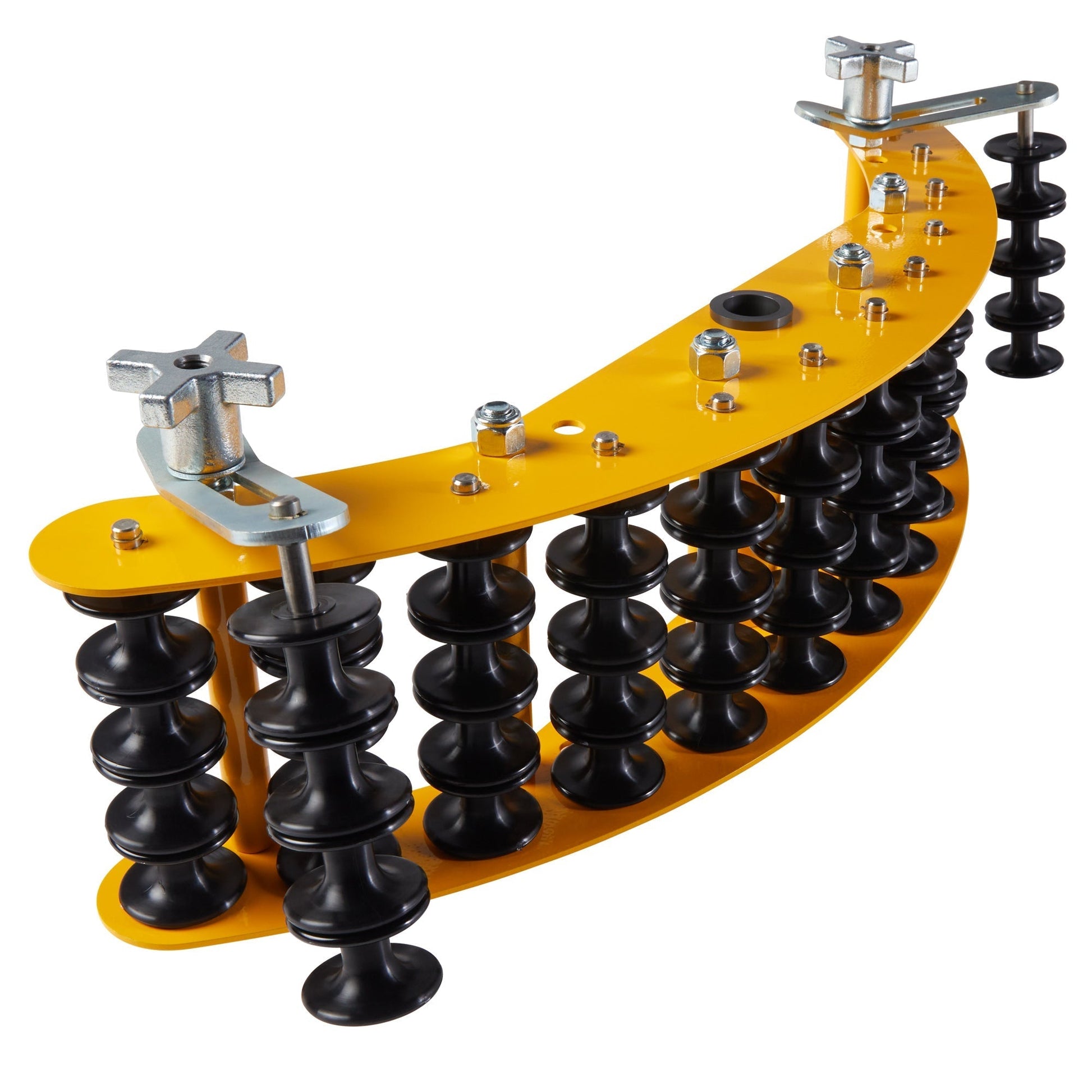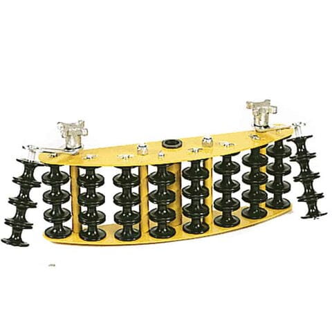 Corner Block, Quad is a 60 degree model featuring four rows of nylon rollers. Corner blocks evenly distribute pressure on coax or fiber cable when pulling around corners. Steel side plates with straight base act as a strut for increased strength. Nylon axle bushings provide easy swivel and longer axle life. Adjustable keeper arm holds cable in place as it is pulled through block. Corner blocks are used to make cable placement easier.