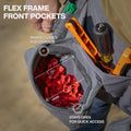 - Front pockets include a Flex Frame that stays open or snaps closed
