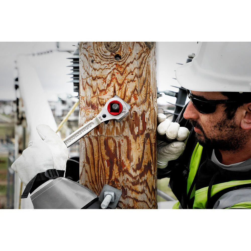 Our MILWAUKEE® Lineman's 5-in-1 Ratcheting Wrench features the most durable ratchet. The ratcheting wrench has built-in strike face offered in both milled and smooth, providing you with a dedicated surface for hammering. These wrenches have large directional switches that you can easily press while wearing gloves. The durable forged steel construction provides you with longer tool life. The high leverage wrench fits 3/4", 1", and 1-1/8" square sockets and 9/16" and 3/4" standard sockets.