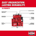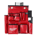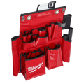 Our Lineman's Compact Aerial Tool Apron provides easy organization and lasting durability. The aerial tool board is designed specifically for our power utility and lineman trades. It features a multi-sized auger holder that won't burn through after extended job site use. The tool apron has 18 custom pockets, including a dedicated flood light pocket, puncture-resistant knife pockets, and magnets to hold sockets in place. The tool board is constructed with durable vinyl material and features two nickel-plated brass eyelets. Built-in weep holes allow for water drainage in the pockets, and the three included D-rings give you additional storage. The MILWAUKEE® aerial tool apron is designed for ultimate durability, giving you a complete and durable storage system specifically designed for the utility trades.