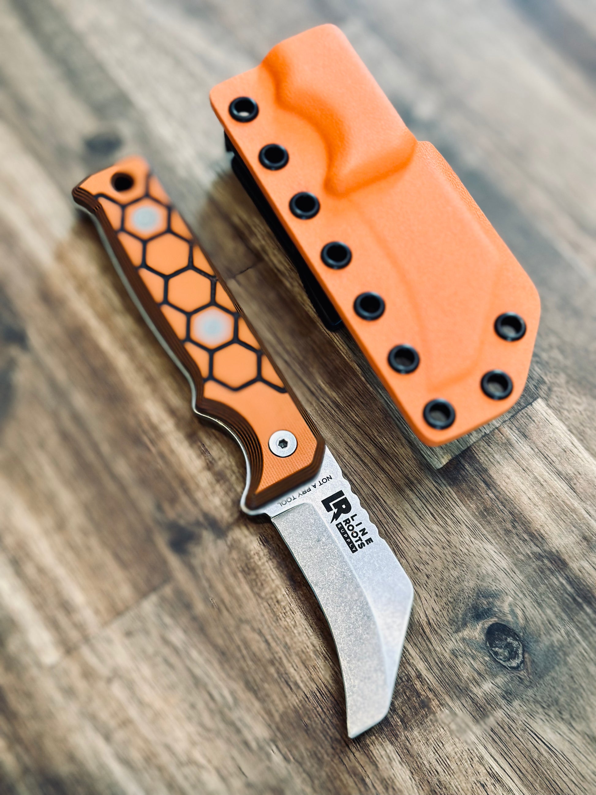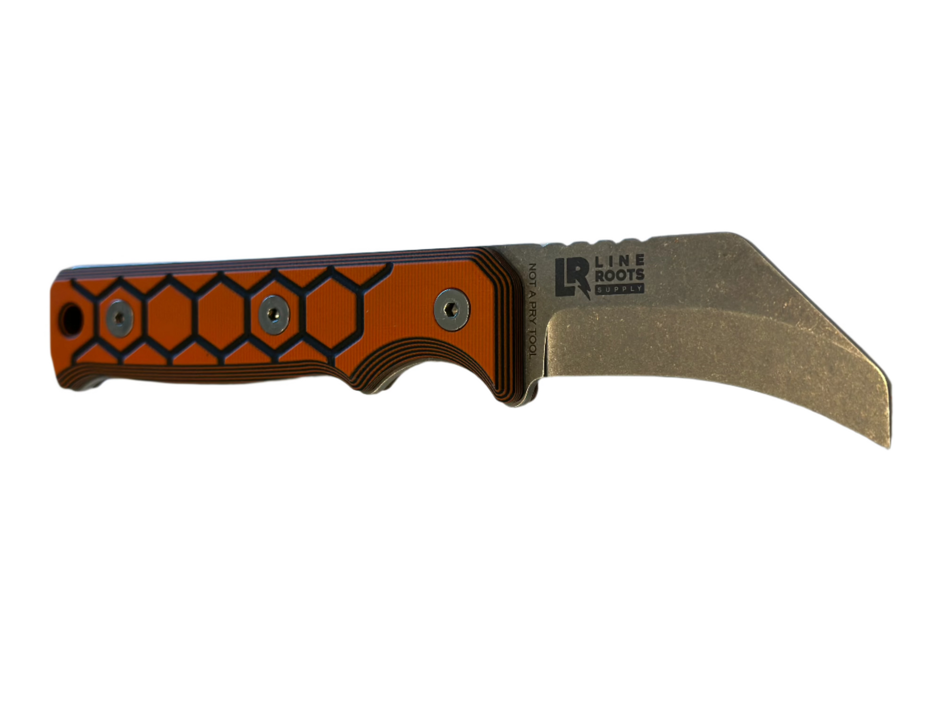 The LR-Lineman Skinner represents the pinnacle of collaboration between Lineroots Supply and Selby Knives, engineered for professionals who demand uncompromising performance. Constructed from premium S35VN stainless steel at 0.095" thickness, this knife features a robust 2.5" blade with a total length of 7.5", striking the ideal balance between utility and precision work. The manufacturing process reflects meticulous craftsmanship: each blade undergoes rigorous professional heat treatment followed by cryogenic tempering to achieve an exceptional 60-61RC Rockwell hardness. This advanced metallurgical approach delivers superior edge retention and durability, enabling the knife to excel in the most demanding cutting applications without compromising performance. The stonewashed finish serves dual purposes—it provides a refined aesthetic while strategically concealing wear patterns, ensuring the knife maintains its visual appeal through extended use. The included orange Kydex sheath features a flexible belt clip system designed for secure carry and rapid blade access, protecting the edge while keeping your tool immediately available when needed. Whether deployed in professional lineage work, outdoor expeditions, or daily carry situations, the Lineman Skinner combines technical excellence with practical functionality. The custom engineering and precision craftsmanship demonstrate Lineroots Supply and Selby Knives' commitment to delivering tools that consistently exceed professional expectations.