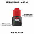 Delivers up to 3X more runtime, 20% more power and 2X more life than standard lithium-ion batteries. The M12™ REDLITHIUM™ 3.0 Compact Battery Pack features superior pack construction, electronics and performance to deliver more work per charge and more work over the life of the pack than any battery on the market. With Milwaukee durability built into each pack, this battery runs cooler and performs in climates below 0°F/-18°C. Its compact design fits in tight work spaces and reduces user fatigue. Managed by Milwaukee's exclusive REDLINK™ Intelligence, the battery features overload protection to prevent you from damaging your cordless power tools in heavy-duty situations, while the discharge protection prevents cell damage. The temperature management system and individual cell monitoring help maximize battery life. Upgrade to the M12™ REDLITHIUM™ 3.0 Compact Battery Pack to instantly increase the runtime and durability of your Milwaukee M12 cordless tools.