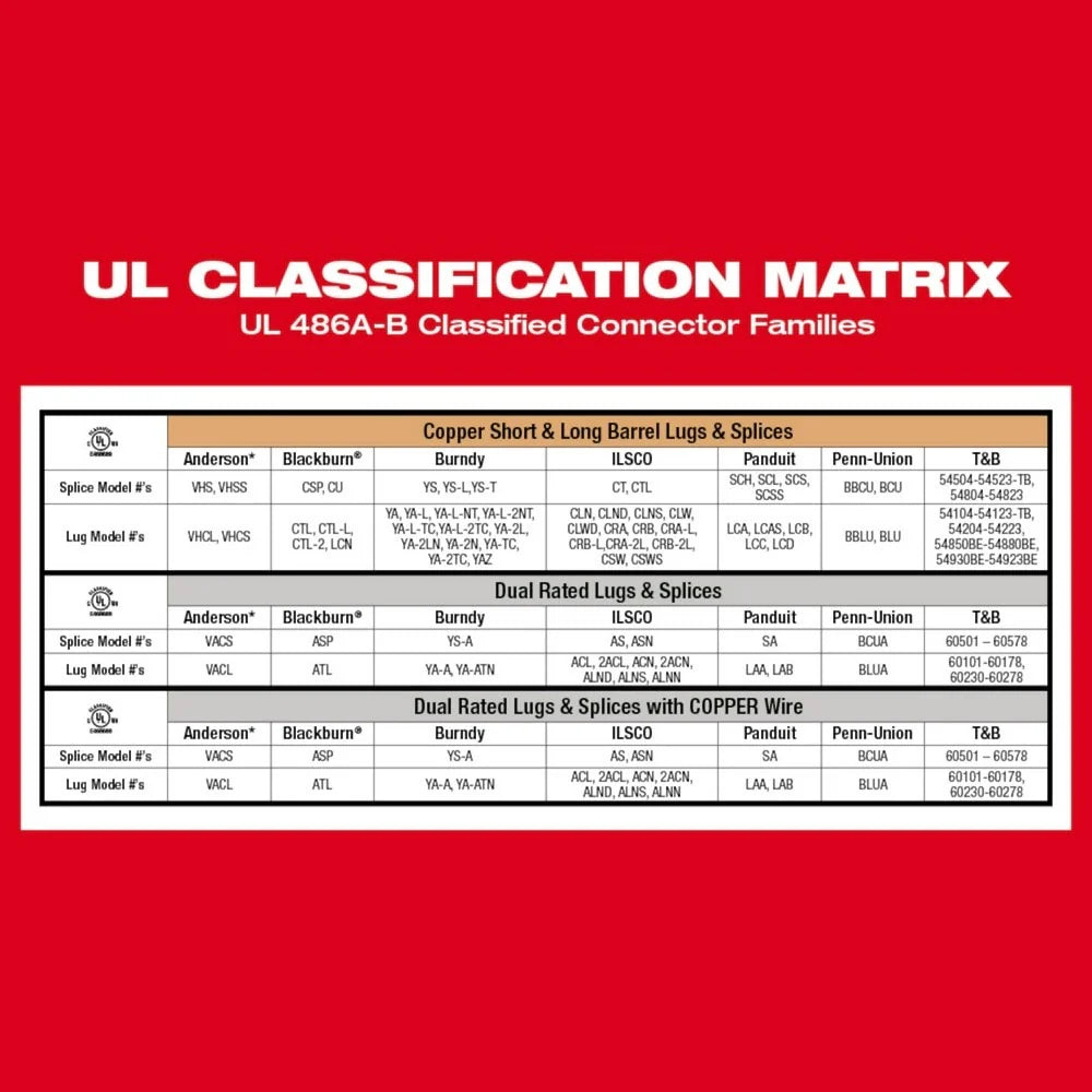- Creates UL Classified crimps under UL 486A-B for #8 – 750 MCM Cu and Dual Rated lugs and splices across several leading manufacturers when used with corresponding Milwaukee dies