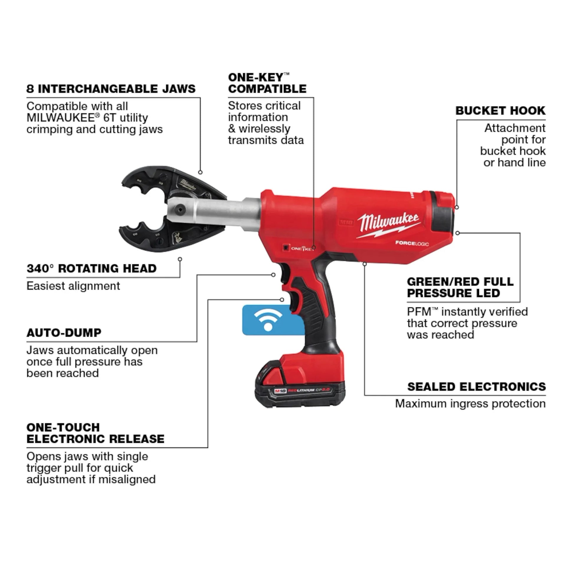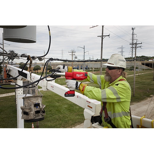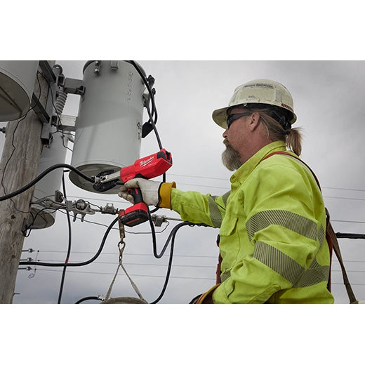 Our M18™ FORCE LOGIC™ 6T Pistol Utility Crimper is The Easiest Way To Crimp Overhead. As the lightest, most balanced 6-ton pistol crimper, it provides linemen the easiest alignment when making connections at shoulder height or above. Predictive Force Monitoring (PFM™) constantly measures force output, delivering the fastest crimp speed while providing accurate pressure and instant verification every time. A 340° rotating head allows for easy access into tight spaces. Compatible with eight crimping and cutting jaws, the crimper delivers the versatility to tackle a variety of applications. With the ability to crimp up to 4/0 line taps and cut up to 750MCM Cu, 1000MCM Al, 477 ACSR, ½” EHS Guy Wire, 3/8” Rebar, and 3/8” Ground Rod by simply changing jaws, the crimper becomes a lineman’s single crimping and cutting solution. With our ONE-KEY™ Technology, MILWAUKEE® Crimpers enable you to store real-time crimp data, generate professional reports, view historical tool performance data, and sync it all wirelessly to the cloud for easy access. The 6T pistol grip cordless crimper features a POWERSTATE™ Brushless Motor, REDLINK™ Electronics, and REDLITHIUM™ Batteries, providing you with unmatched reliability in the toughest conditions.