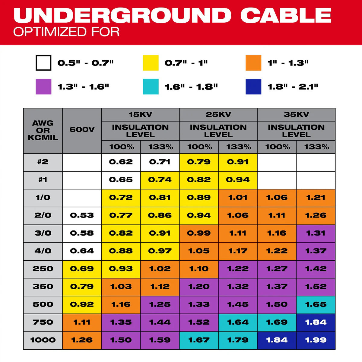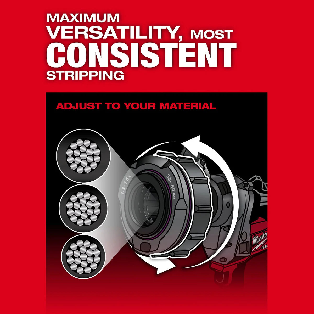 The MILWAUKEE M18 FUEL Covered Conductor Cable Stripper with Adjustable Bushings is the industry's first cordless tool optimized for end-stripping insulation on aerial, 600V secondary, and medium-voltage cables, offering an unmatched cable stripping experience. Designed for ultimate versatility, our six adjustable bushings accommodate cable diameters from 0.5" to 2.1", eliminating the need for excess accessories while ensuring a clean, precise strip every time. Powered by M18 FUEL, our cordless stripper removes covered conductors at 1" per second, up to 4X faster than manual tools, boosting efficiency and productivity. With no exposed blades, this solution significantly reduces the risk of cuts and lacerations, providing a safer way to strip the covered conductor. AUTOSTOP kickback control prevents over-rotation in a bind-up, while user-controlled speed and optimized max RPMs provide precise control during operation. Equipped with an adjustable 6" depth gauge for precise strip lengths, the tool eliminates over- or under-stripping and can be removed for extended-length applications as needed. Delivering optimized ergonomics, the tool's pistol-grip design ensures easy maneuverability in tight spaces. POWERSTATE Brushless Motor delivers more power to handle tough materials in any environment. REDLINK PLUS Intelligence ensures peak performance while protecting against overload, and ONE-KEY delivers easy tracking and tool management.