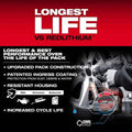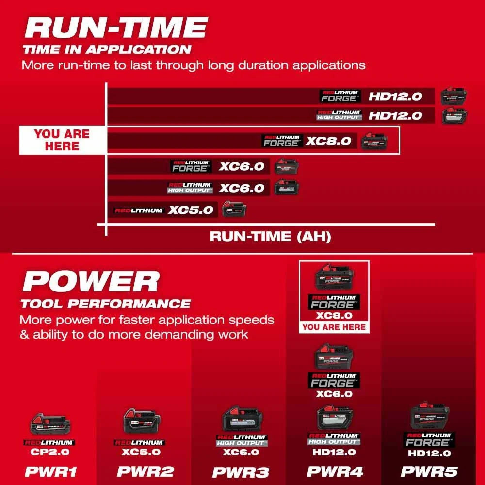 The M18 REDLITHIUM FORGE XC8.0 Battery Pack delivers HIGH OUTPUT 12.0 power in a smaller size, high-speed cooling for less downtime in high-demand applications, 35-minute supercharge to 80%, and the longest life vs REDLITHIUM batteries. REDLITHIUM FORGE are Milwaukee's most powerful, fastest charging, and longest-life batteries. The M18 REDLITHIUM FORGE XC8.0 delivers 8 amp hours of runtime with the same power as the M18 REDLITHIUM HIGH OUTPUT HD12.0, in a smaller size and lighter weight design. The M18 REDLITHIUM FORGE XC8.0 is COOL-CYCLE capable. COOL-CYCLE Active Cooling System provides high-speed cooling for less downtime. Patented ingress coating provides increased protection to maximize active cooling through an upgraded venting design. The high-speed cooling feature works with M18 chargers that have COOL-CYCLE capability. When paired with the M18 Dual Bay Simultaneous Super Charger, this battery charges in just 35 minutes to 80%, getting you back to work faster than ever before. This lithium-ion battery has the longest life, the most recharges, and the best performance over the life of the battery. It is also designed with resistant housing for increased protection against exposure to common oils, greases, and solvents. REDLINK Intelligence protects the battery from overloads, preventing you from damaging your cordless power tools in heavy-duty situations. The M18 REDLITHIUM FORGE XC8.0 battery is fully compatible with 250+ M18 solutions.