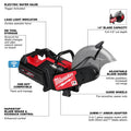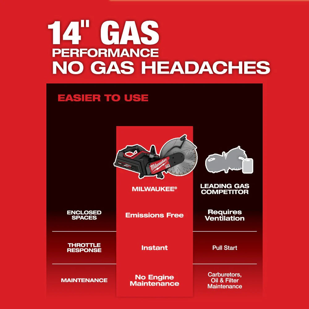 The MILWAUKEE MX FUEL 14" Cut-Off Saw w/ RAPIDSTOP Brake delivers 14” gas performance with no gas headaches. The POWERSTATE Brushless Motor delivers the power to cut tough materials like concrete, rebar, and ductile iron. It delivers instant power with a push-button start and eliminates the repetitive motions of a pull start, providing faster cutting from start to finish. No gas engine means fewer wearable parts, less noise and vibration, and zero emissions for a safer workplace indoors or outdoors. RAPIDSTOP Blade Break & Kickback Control provides enhanced safety by stopping the blade in three seconds during regular use and in cases of kickback. With two (2) MX FUEL REDLITHIUM FORGE XC8.0 Batteries, it can cut 28 ft fully plunged in concrete or 240 cuts in #5 rebar. In just 45 minutes, you can charge an MX FUEL REDLITHIUM FORGE XC8.0 to 100%. Both the MX FUEL REDLITHIUM FORGE XC8.0 Battery & MX FUEL Super Charger are COOL-CYCLE Capable. COOL-CYCLE Active Cooling System provides high-speed cooling for less downtime. The REDLINK PLUS Intelligence ensures optimal tool performance and provides overload protection during tough applications. The Saw is ONE-KEY Compatible: Track, manage, and secure equipment from your mobile device or computer. The saw includes a load light indicator that optimizes runtime and blade life, as well as an electric onboard water connection that releases water only when the trigger is released, reducing mess onsite.