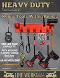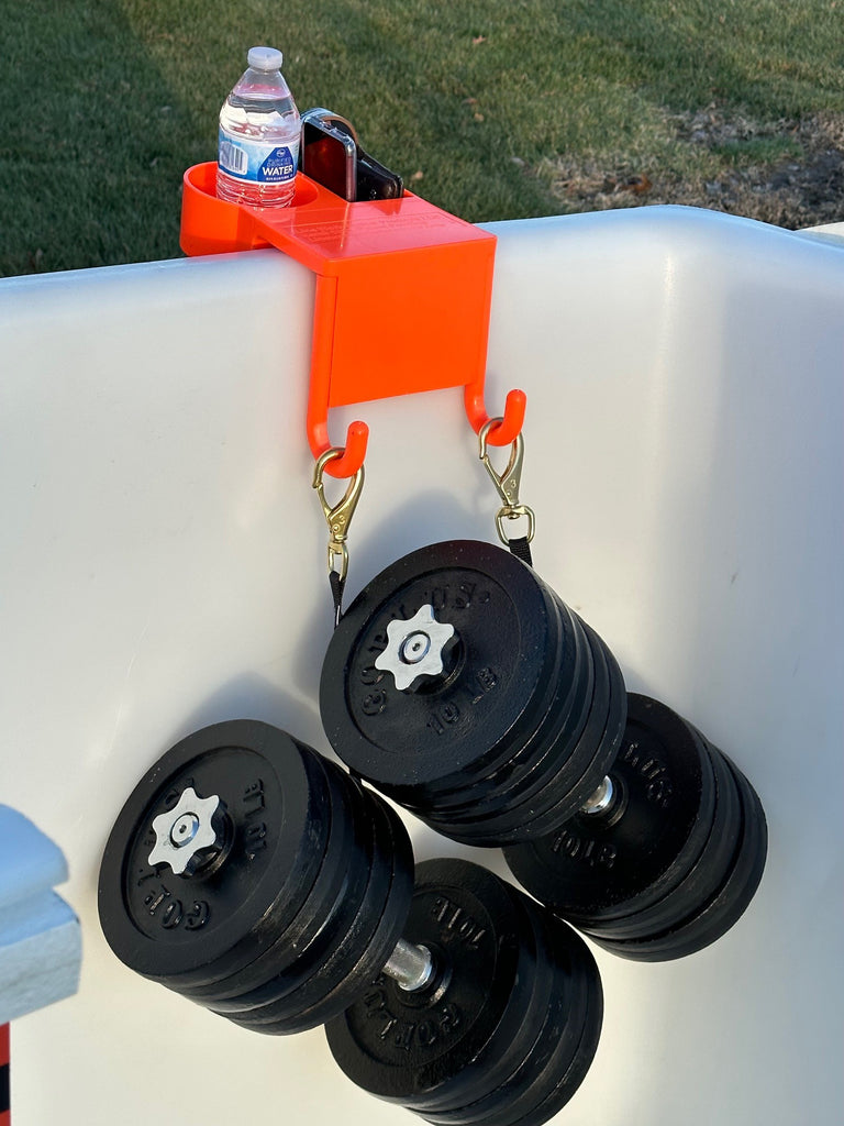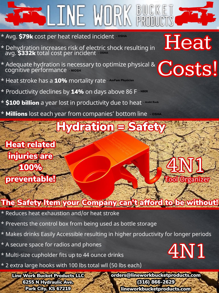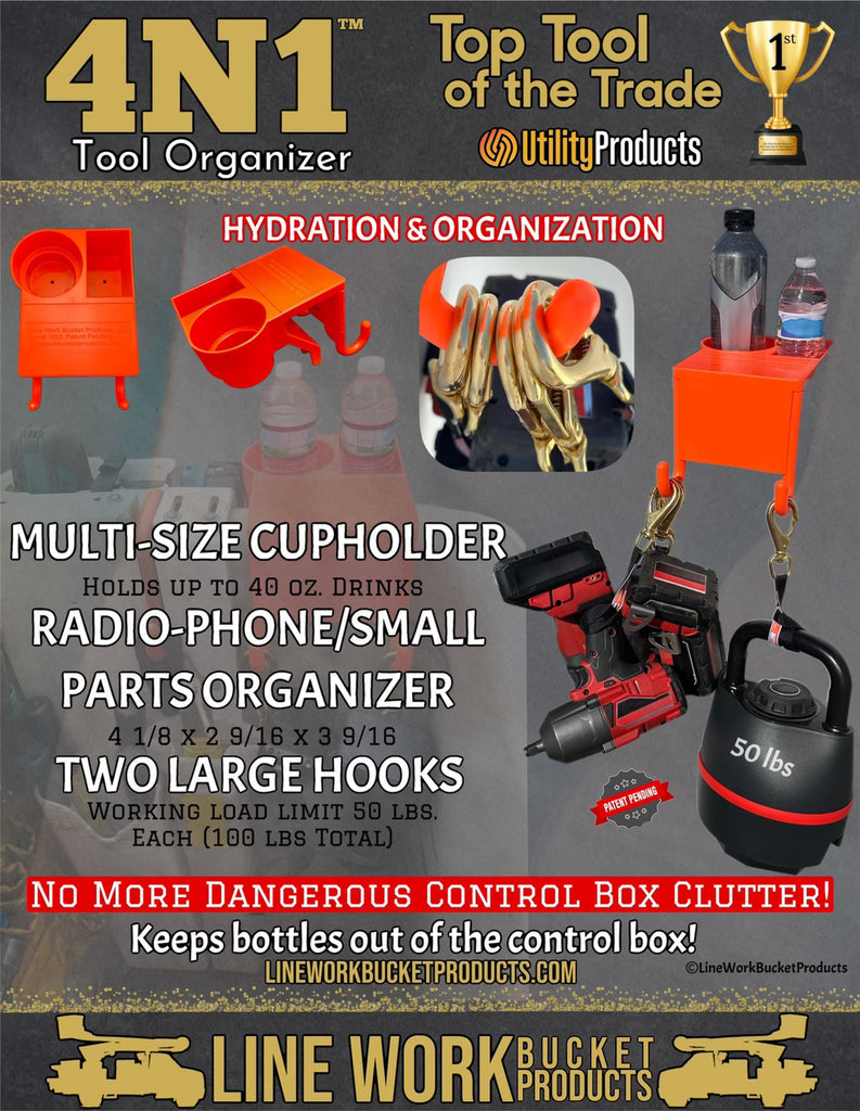 Helps bucket truck workers stay hydrated, organized, and accessible with a phone/radio compartment. The hooks are extra large for larger tools and hoists. Fits on a bucket like a 3 inch bucket hook.
