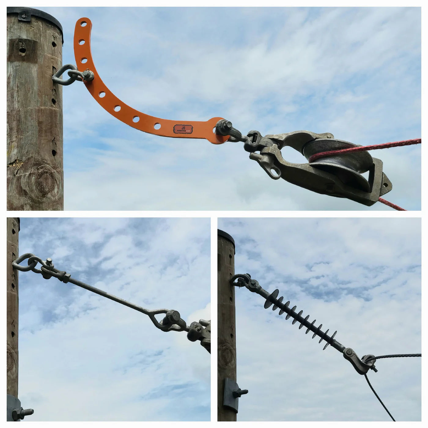 The Sag Stix, the first of its kind, offers a safe and adjustable solution for hanging dollies on swing angle poles during wire pulls. Designed with 8 different spacing options, these steel plate tools have a powder coated Hi-Viz orange finish and can support up to 2,800lbs of vertical load, exceeding the capacity of the common X100 aluminum stringing dollies. Sold in packs of 3, they are the perfect tool for maintaining proper spacing and positioning for wire sag.