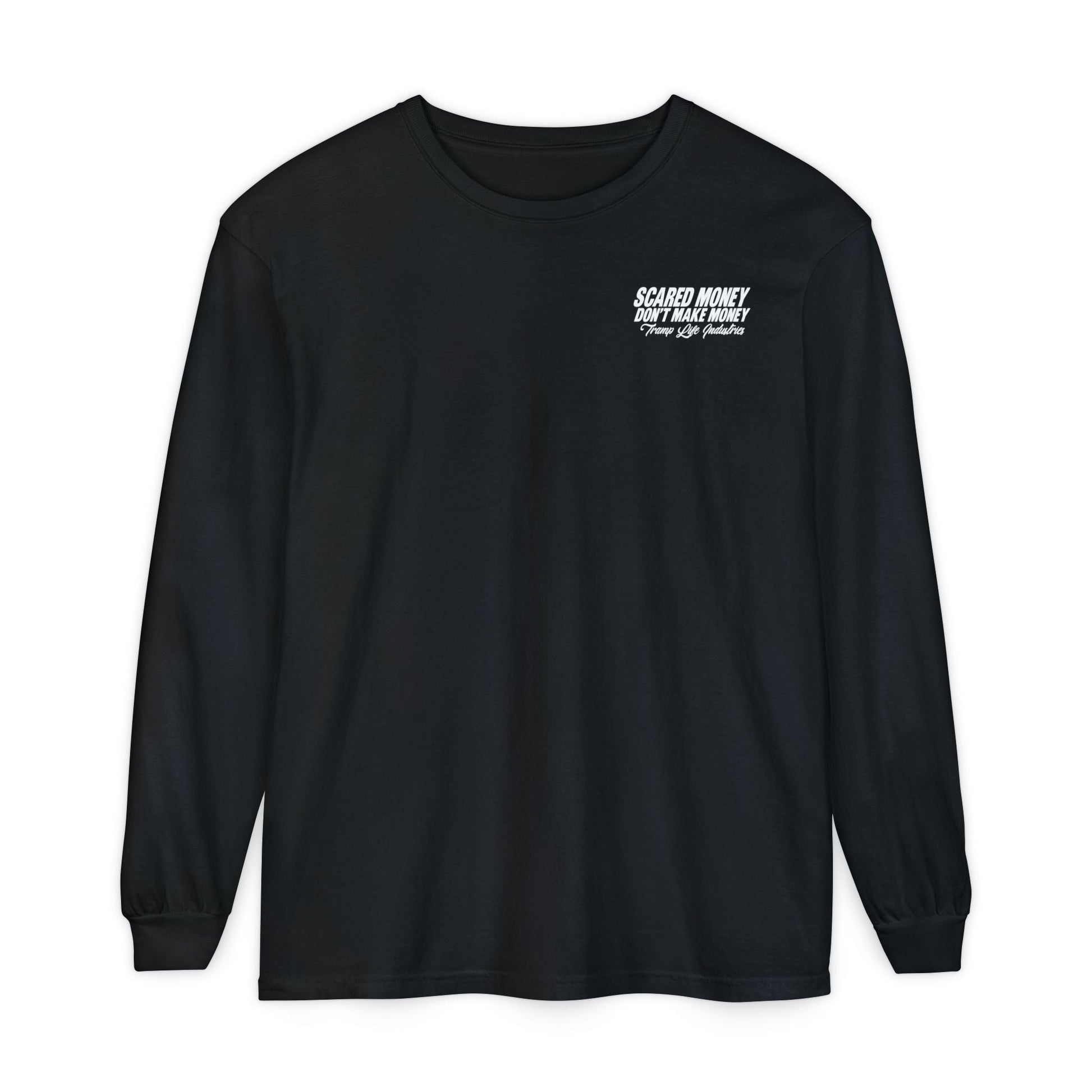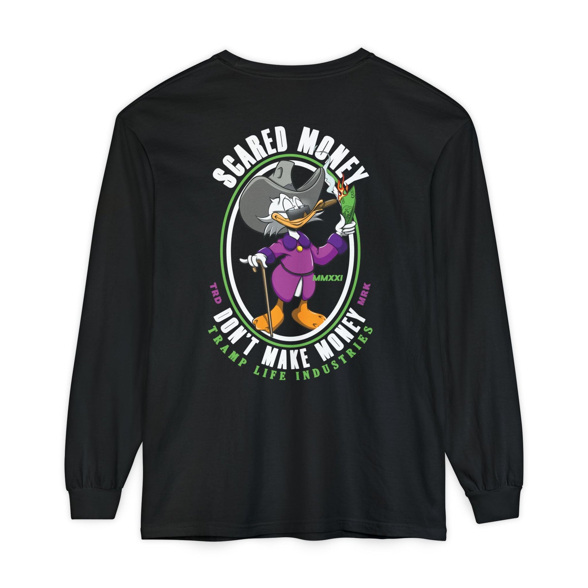 This long sleeve shirt showcases a cartoon duck dressed in a purple suit, wide-brim hat, and cane, holding cash with a confident grin. The phrase “Scared Money Don’t Make Money” wraps around the character, echoing the Tramp Life Industries philosophy: success comes to those willing to take risks and work for their goals. Designed for individuals who value hustle and determination while expressing their style, this shirt makes a statement for anyone driven by ambition and real passion for earning a living.