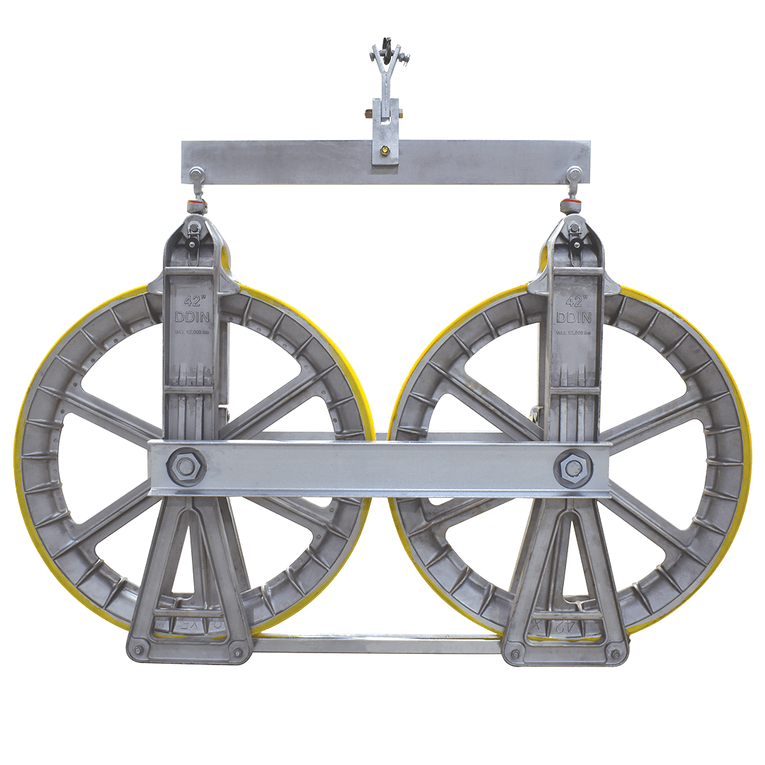 DDIN Tandem Stringing Blocks are constructed of high-strength aluminum alloy, making them lightweight, strong, and durable. The urethane lined sheaves prevent damage to the conductor and the anti-friction ball bearings packed with synthetic aviation grease make these blocks resistant to extreme conditions.