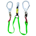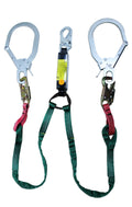 - Lanyard features a 5 dual tie-back lanyard with wear guard and rescue loops and 12 fall ANSI rated shock absorber.