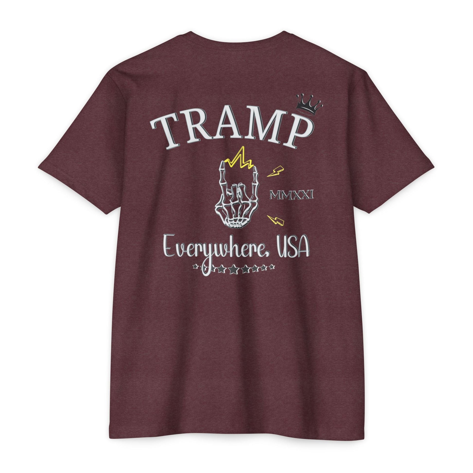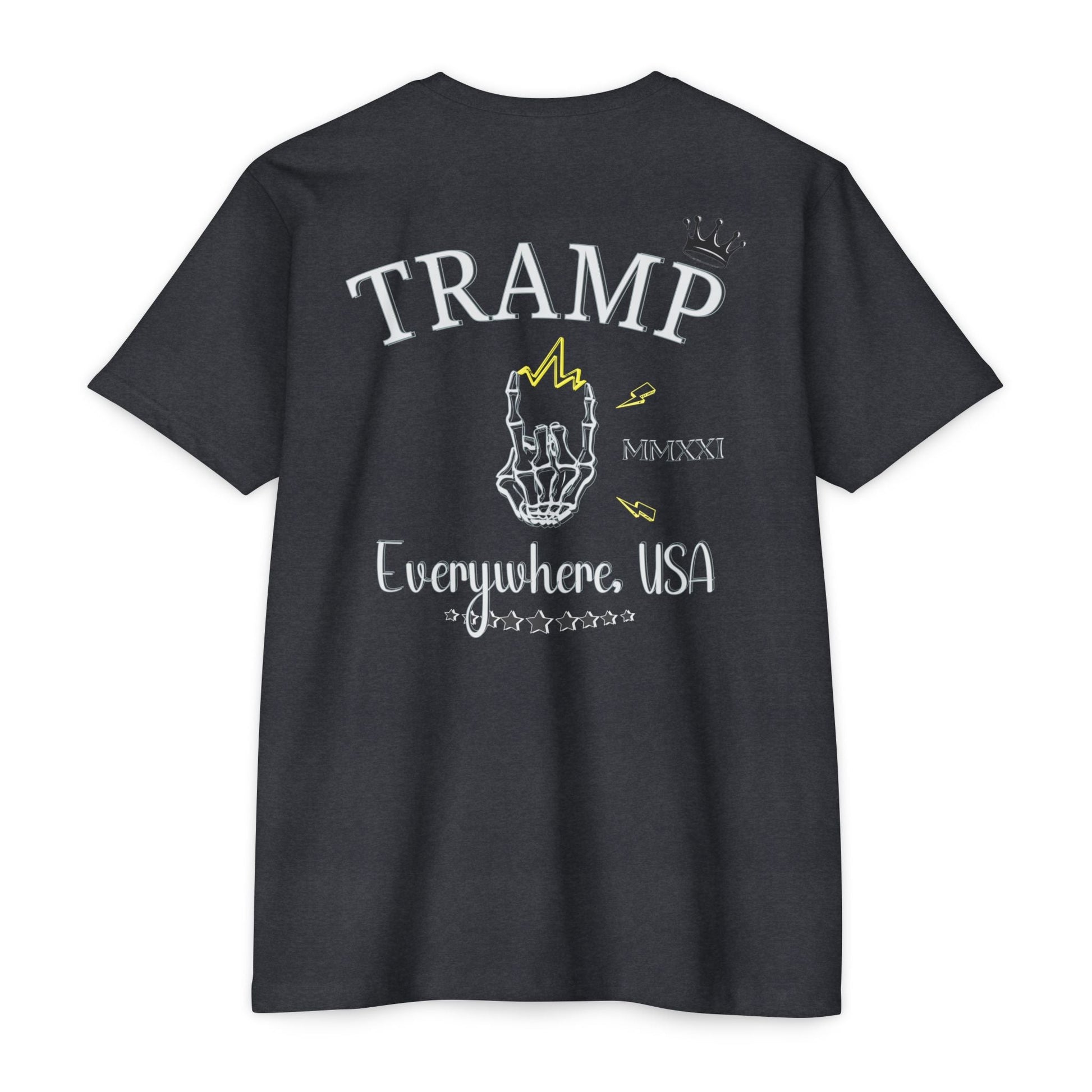 From back roads to big cities, the Tramp Everywhere Tee rides with you. Featuring a bold skeleton hand throwing the horns, electric yellow lightning bolts, and “Everywhere, USA” proudly stamped underneath, this shirt is built for the wanderers and workers who keep America running.