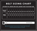 To ensure your best fit measure a belt that you currently wear on a daily basis from the inside edge of the buckle to whichever hole you regularly use (most worn hole) and that should determine which size you will need to order. If your current belt size is an odd size (i.e. 35") then round up to the next even size (i.e. 36").
