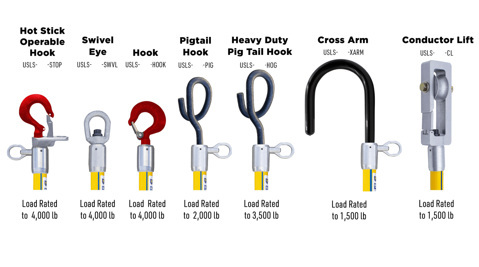 BLUE STRIPE® Link Sticks are available in various configurations. The Swivel Eye, Hook & Swivel Eye, and Hot Stick Operable Hook & Swivel Eye are load rated to 4,000 lbs. and feature 1.25” diameter foam filled fiberglass.