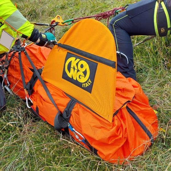 Anti-Rotation manual control system for Kit EVEREST designed for helicopter hoist recovery. The system is operated using the handle and ensure the spinning effect controls (due to the downwash) that occurs during recovery by helicopter. The anti-rotation rudder is fixed using two Velcro straps at the lowest stretcher part (rescuer right hand). Also the VAR is located at the foot side and its handle is facing the patient’s head. On the lower edge of the rudder there are two slots that enable the external closing straps of the EVEREST bag to be fitted properly. High quality product, made in Italy!