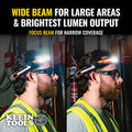 Klein Tools Widebeam Headlamp with strap and rechargeable battery can be worn on any Hard Hat, Safety Helmet, or directly on the head. Headlamp provides up to 575 lumens of bright light and runs for up to 12 hours. This headlamp also features All-On or direct Focus modes with multiple lumen settings for a variety of applications and jobsite needs.